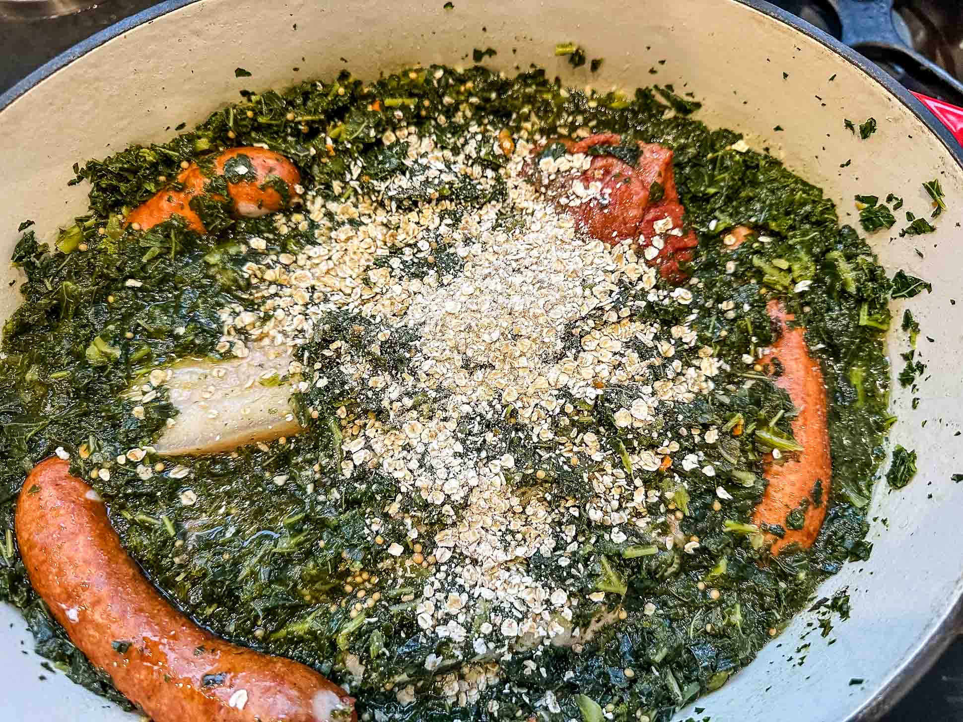 Das Besondere an meinem Familienrezept ist, dass der Grünkohl mit Haferflocken gebunden wird. Genau 40 g Haferflocken sorgen dafür, dass der Kohl eine leicht sämige, Konsistenz bekommt. Dieses kleine Küchengeheimnis stammt von meiner Oma und macht den Kohl besonders rund im Geschmack.