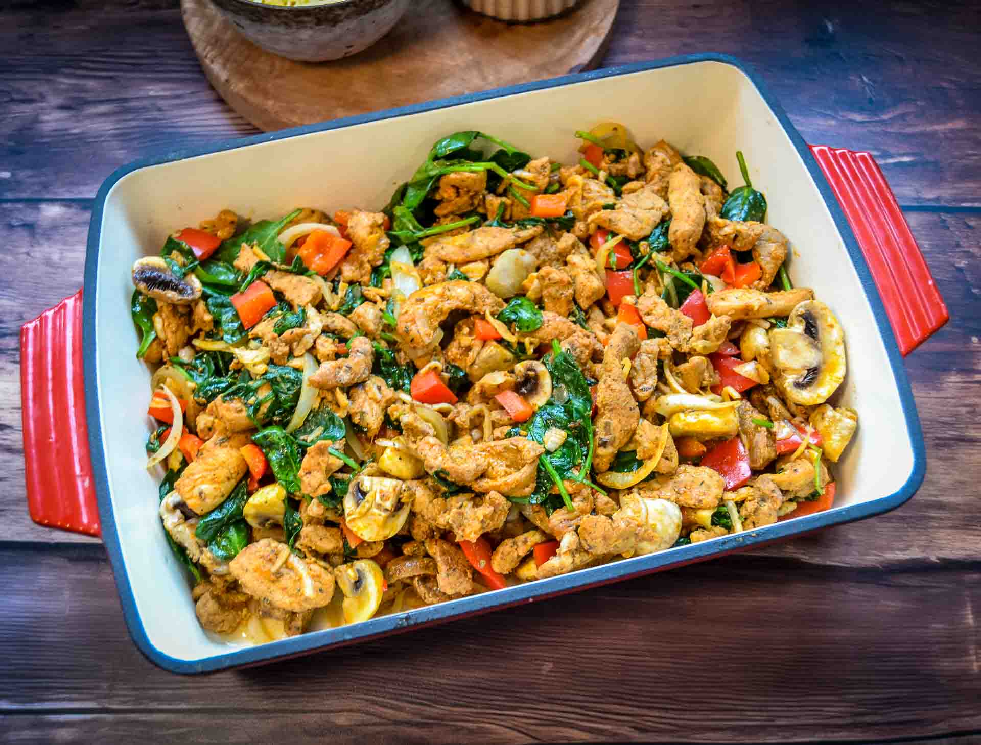 - Stelle dir deine Zutaten bereit und heize deinen Backofen auf 180 Grad Umluft vor. Wasche die Paprikaschoten, den Spinat und putze die Champignons. Schäle, die Zwiebel und den Knoblauch. Hacke den Knoblauch und die Zwiebel, schneide die Paprika in Würfel und viertel die Pilze.