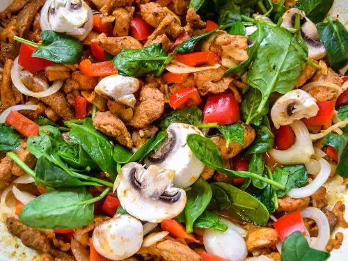 - Erhitze etwas Olivenöl in einer großen Pfanne und brate das Gyros von allen Seiten an, dann gebe die Paprika, Zwiebel und Knoblauch dazu und brate es weitere 5 Minuten. Als Nächstes kommen die Pilze, Blattspinat und gebe 2 EL Oregano dazu. Wenn der Spinat etwas zusammen gefallen ist,