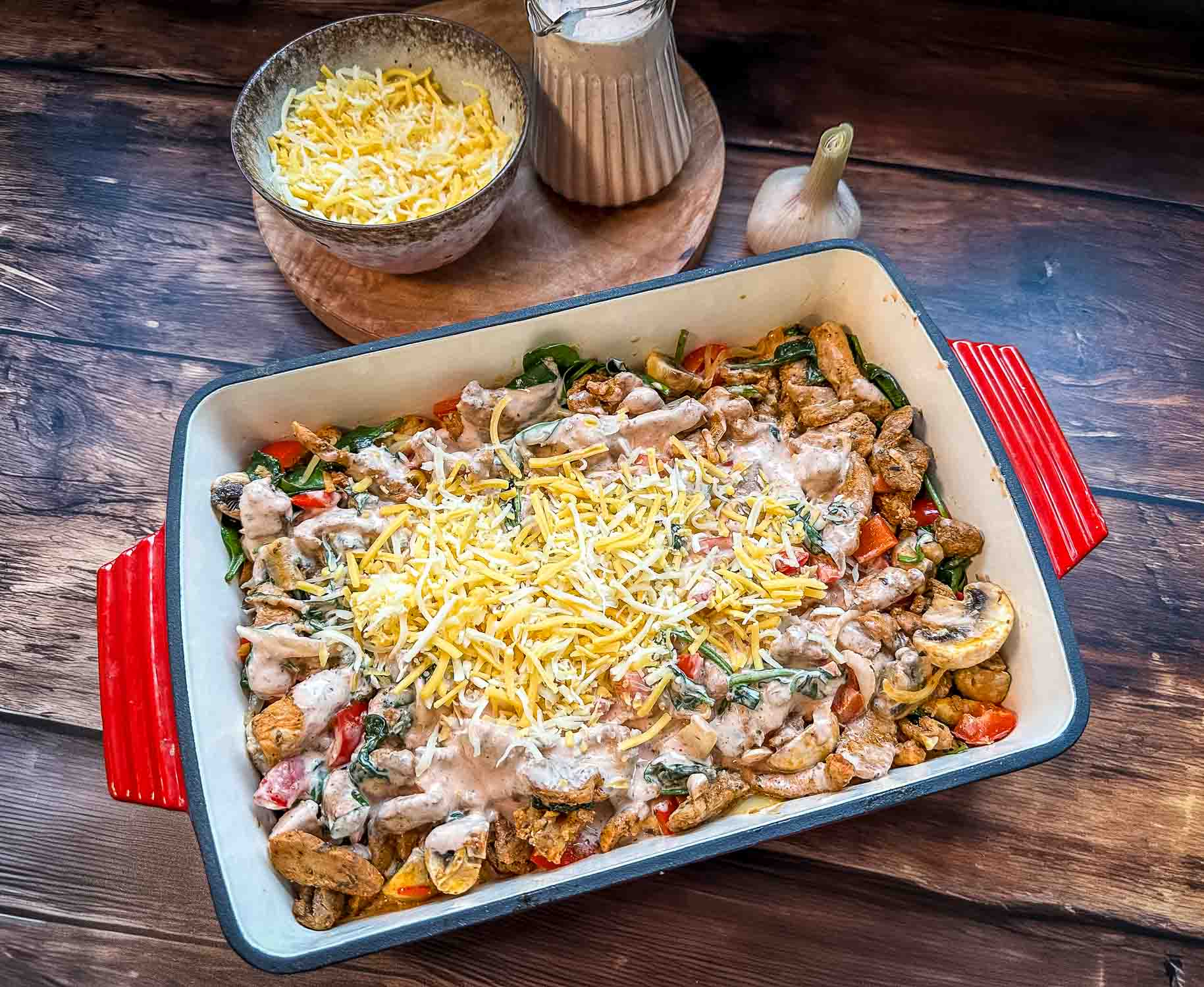 Cheddar-Mozzarella-Mischung 150 g: Diese Käsemischung sorgt für eine wunderbar goldene, aromatische Kruste. Der Cheddar bringt kräftigen Geschmack, während der Mozzarella für die typische, leicht ziehende Konsistenz beim Überbacken sorgt. Alternativ kannst du auch Gouda oder Emmentaler verwenden.