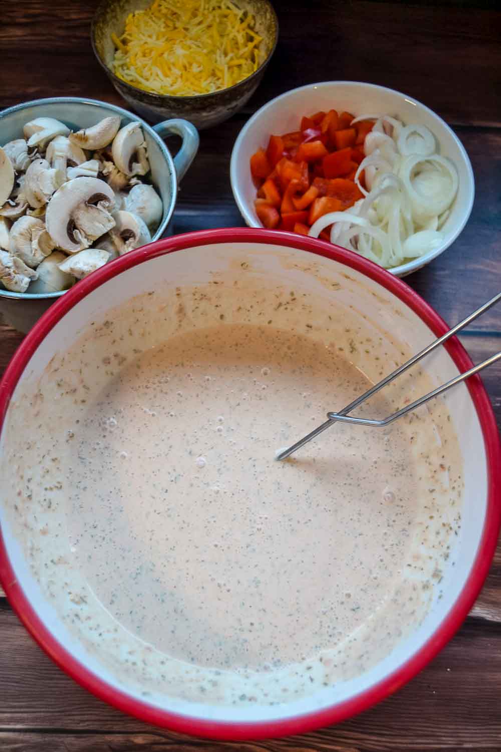 - Verrühre in einer großen Schüssel die Sahne, Crème fraîche und das Tomatenmark, würze die Soße mit Pfeffer, Salz, 1 EL Oregano und Paprikapulver.