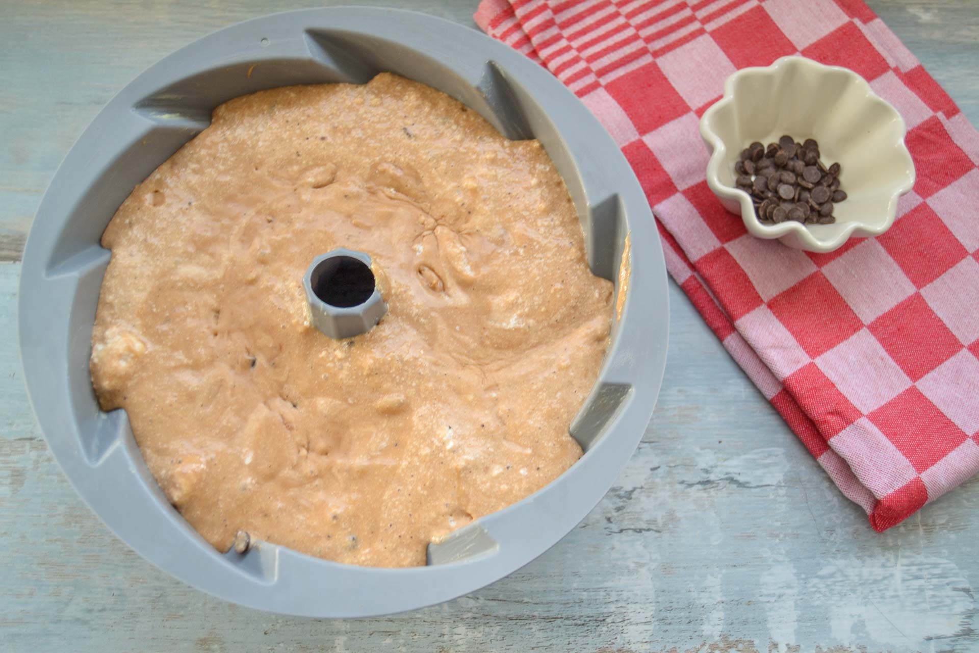 - Den Teig entweder in eine gefettete Form füllen oder wie ich in eine Silikon Gugelhupf Form füllen.