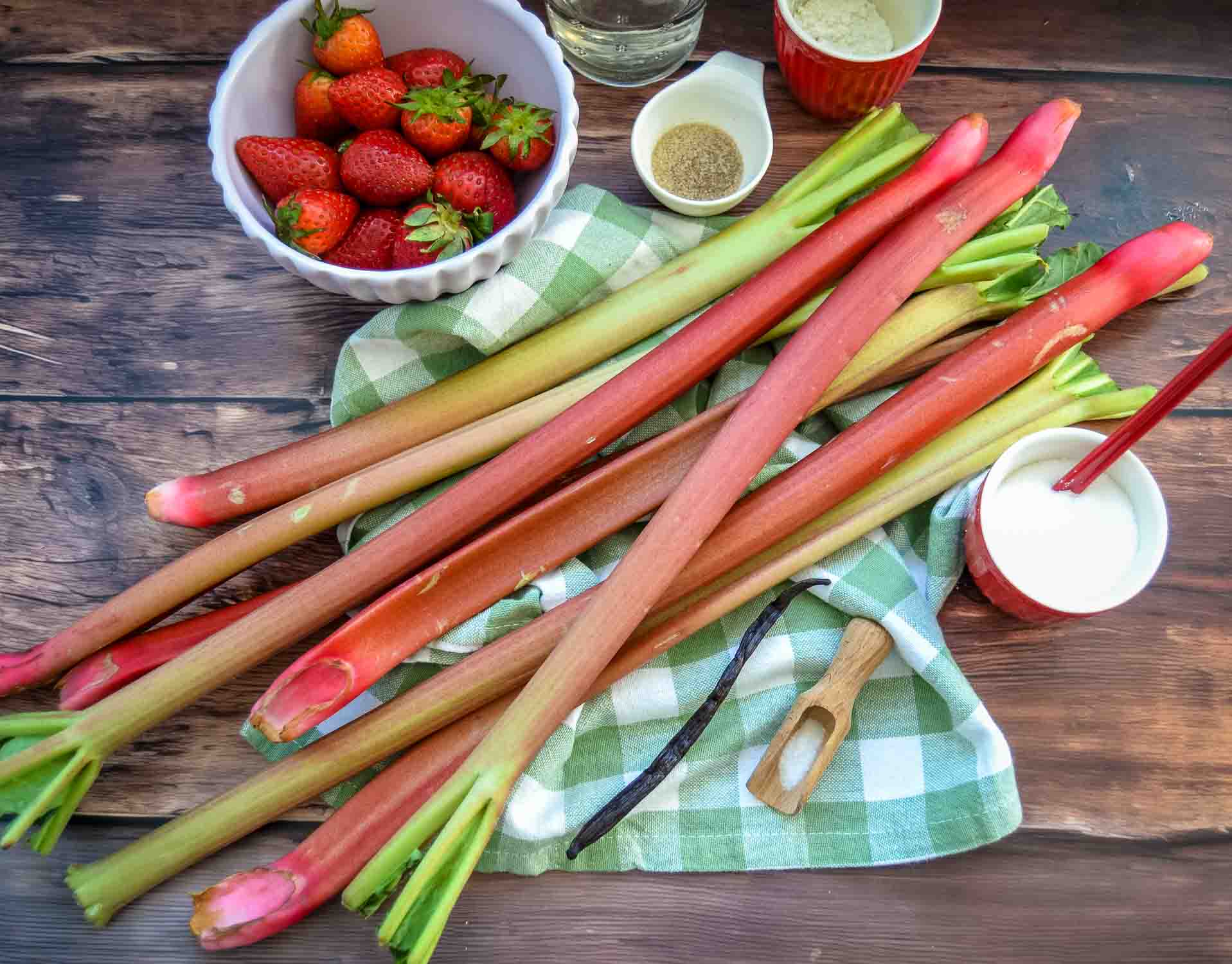 - Stelle dir deine Zutaten bereit, schneide die Blätter und das Ende der Rhabarberstangen ab. Wasche die Erdbeeren und den Rhabarber gründlich. Die Vanilleschote der länge nach aufschneiden und das Vanillemark mit einem Messer aus der Schote kratzen.