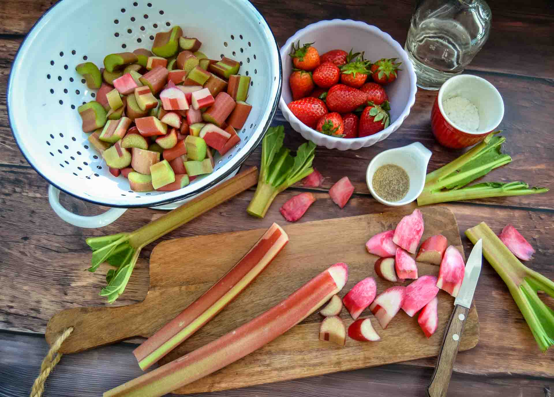 - Danach schneide die Rhabarberstangen in ca. 2 cm breite Stückchen. Die Erdbeeren halbiere und viertel sie je nach Größe.