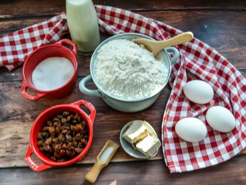 • Rosinen vorbereiten: Weiche die Rosinen am besten schon am Vortag in einem Schraubglas in Rum, Apfelsaft oder Wasser ein. Stelle alle Zutaten bereit. Erwärme die Milch kurz, bis sie lauwarm ist.