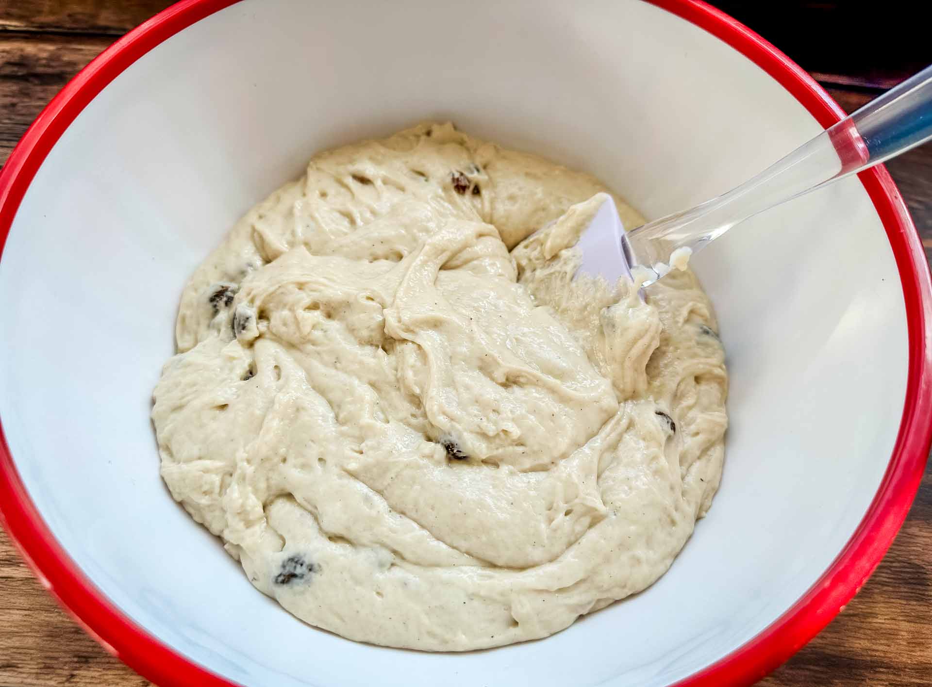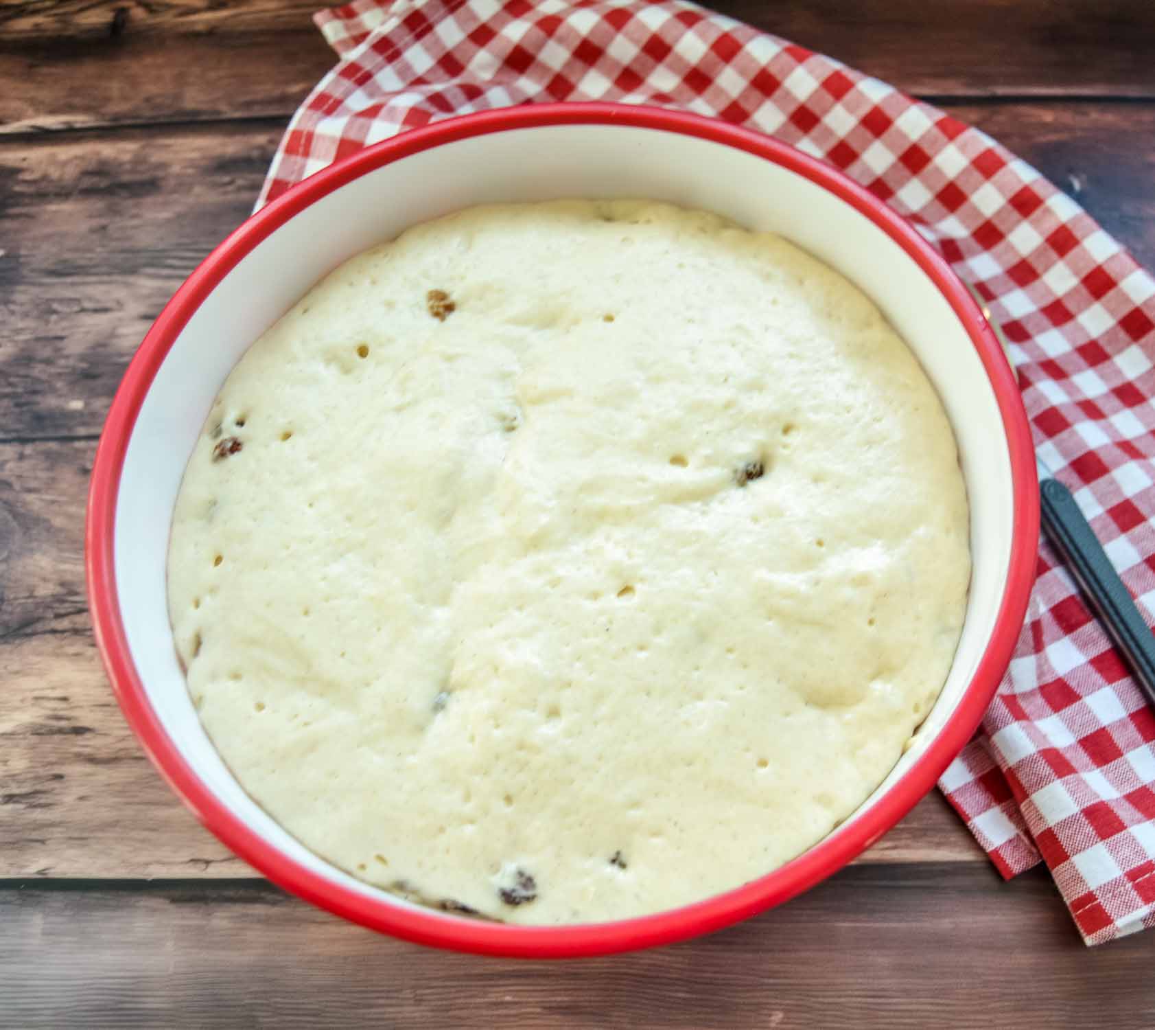 • Hebe die eingeweichten Rosinen vorsichtig unter. Decke die Schüssel mit einem Küchentuch ab und lasse den Teig an einem warmen Ort mindestens 1 Stunde gehen, bis er sein Volumen deutlich vergrößert hat.