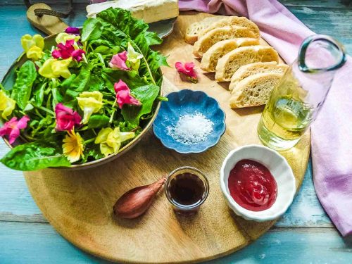 Wir mögen den leckeren Salat sehr gern mit einer fruchtigen Himbeere Dressing. Wenn ich den Wildkräuter Salat als Vorspeise zubereite, röste ich Baguette und überbacke die Scheiben mit Ziegenkäse.