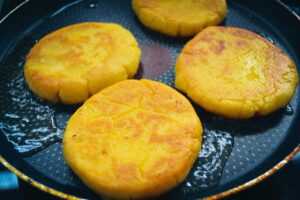 Die Arepas in heißem Öl oder Butterschmalz von jeder Seite ca. 3 Minuten in der Pfanne braten.