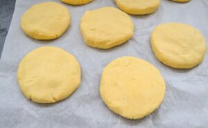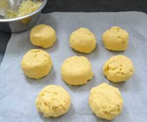 Den Maisteig in Portionen teilen und kleine Bällchen aus dem Maisteig formen und am besten auf ein Backpapier setzen.