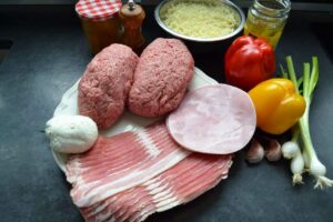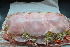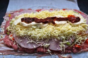 Alle Zutaten bereitstellen, das Gemüse waschen und putzen, Knoblauch schälen und hacken. Das Hackfleisch mit Salz und Pfeffer würzen und den mit dem gehackten Knoblauch vermischen. Ein großes Stück Backpapier auf die Arbeitsfläche legen.