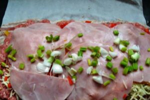 Die Lauchzwiebeln würfeln und auf dem Schinken verteilen.