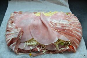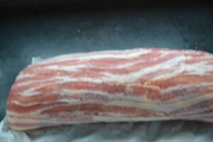 Die Baconstreifen-Enden von beiden Seite etwas über den Schinken legen.