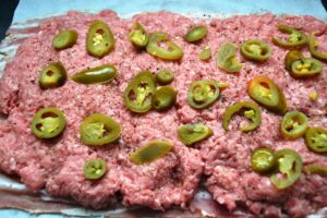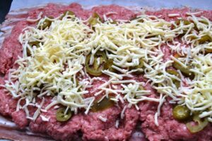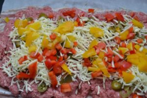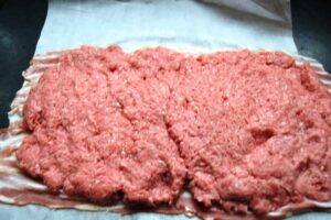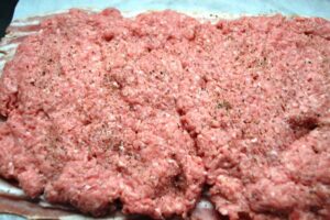 das Hackfleisch darauf verteilen und etwas flach drücken