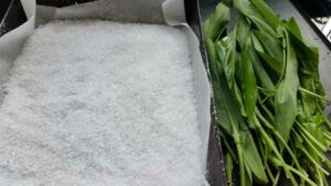 Alle Zutaten bereitstellen. Den Bärlauch gründlich waschen, am besten ist es du hältst einen kleinen Büschel unter fließend Wasser. Den Bärlauch abtropfen lassen und auf Küchenkrepp oder einem Geschirrtuch trocknen. Eine große Auflaufform oder ein Backblech mit einem Bogen Backpapier auslegen. Das Salz in der Form gut verteilen