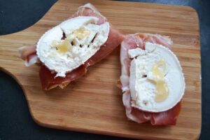 Den Schinken auf die Tomaten legen und eine Ziegenkäse-Scheibe auf den Schinken legen. Etwas Honig auf den Käse geben und