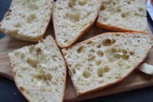 und das Baguette halbieren und in Stücke schneiden und die im vorgeheiztem Backofen 5 Minuten rösten.