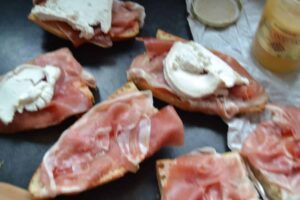 Leckeres Bruschetta mit Ziegenkäse, Tomate und Serano oder Parmaschinken, etwas Rosmarinhonig. Ein super schneller leckerer Snack und ganz köstlich zum Aperitif oder kleine Vorspeise.