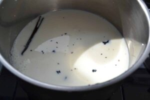 Die Milch mit der aufgeschnittenen Vanilleschote erhitzen sie muss nicht kochen. Ich kratze das Mark aus der Schote da ich finde das die Creme dann intensiver nach Vanille schmeckt . Der nachteil ist das man die Vanillekörnchen dann in der Creme sieht auch wenn man die Milch durch ein Sieb gießt.