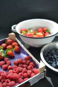 Die Erdbeeren , Himbeeren und Heidelbeeren waschen .