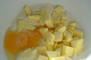 die kalte Butter würfeln und mit dem Ei und Eigelb unter das Mehl und die anderen Zutaten kneten