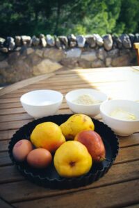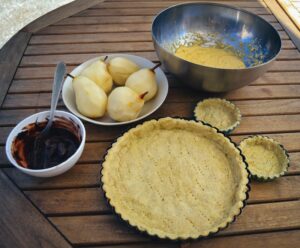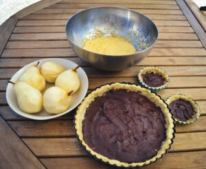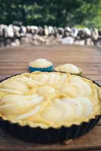 Für die Birnentarte muss der süße Tarteboden vorher ca. 8 Minuten blind vor gebacken werden. In meinem Grundrezept für süßen Tarteteig habe ich genau beschrieben wie man den Tarteteig blind vor backt.