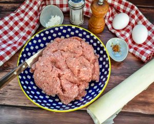 Als Erstes heize deinen Backofen auf 200 Grad Umluft vor, und lege ein Backpapier auf ein Backblech. Fülle das Mett in eine Schüssel. Trenne die Eier