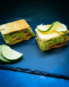 Millefeuille aux Saint Jacques - französische Blätterteigschnitten gefüllt mit Jakobsmuschel und einer Creme aus Avocado, Koriander, Limette und roter Chili. Ein einfaches Rezept für eine tolle Vorspeise .