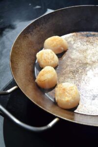 die Jakobsmuschel je 2-3 Minuten von jeder Seite in etwas Olivenöl braten
