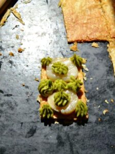 Die Blätterteigplatte in gleich große Stücke schneiden und mit den Jakobsmuschel Scheiben belegen und die Avocadocreme in die Lücken spritzen . Eine zweite Blätterteigplatte drauf legen und nochmal mit den Muschelscheiben und der Avocadocreme füllen