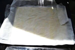 Die Blätterteigplatte mit Backpapier auf ein Blech legen und noch eine Lage Backpapier auf den Blätterteig legen