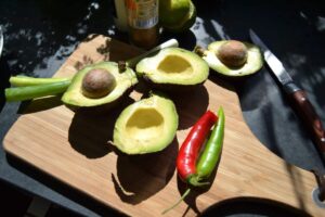die Avocado halbieren und das Fruchtfleisch mit einem Löffel