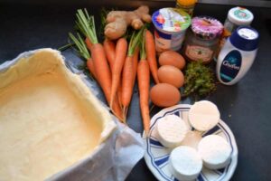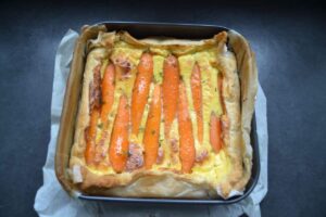 Herzhafte leckere vegetarische Quiche mit Blätterteig, Möhren und Ziegenfrischkäse auf einem knusprigen Teigboden. Lecker als Snack oder Hauptgericht