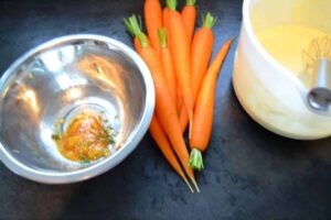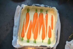 Die Quicheform mit Backpapier auslegen und den Blätterteig in die Form geben. Den Möhren bis auf ein kleines Stück das Grün abschneiden und gründlich waschen und schälen. In einem Topf Salzwasser zum Kochen bringen und die Möhren je nach Dicke ca. 10 -12 Minuten kochen
