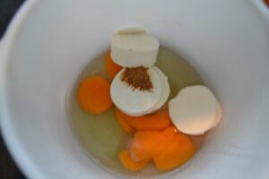 in der zwischen Zeit die Eier mit dem Crème fraîche, den Gewürzen, Ingwer und der Hälfte von dem gehacktem Thymian und dem Ziegenkäse gut verrühren.