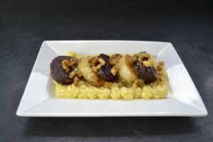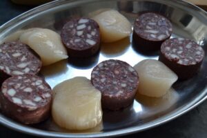 Leckere gebratene Pfälzer Blutwurst mit Jakobsmuschel auf einem sahnigen Pastinaken-Püree. Dazu gebratene Apfel und Schalotten Würfeln mit einem Senfschaum.