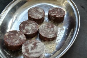 mit etwas Mehl die Blutwurst von beiden Seiten bestäuben