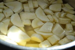 schälen und klein schneiden in gesalzenem Wasser ca. 25 Minuten kochen