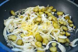 die Gurkenscheiben zufügen und alles kurz braten. Die Zwiebeln aus der Pfanne nehmen