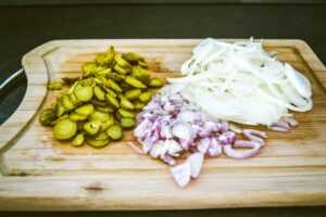 Die Zwiebel und Schalotten schälen. Schalotten klein würfeln und die Zwiebel in dünne Scheiben schneiden. Die Cornichons in nicht zu dünne Scheiben schneiden.