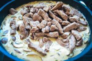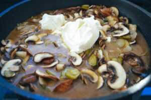 Mit dem Rinderfond auffüllen. Die Speisestärke mit etwas Wasser anrühren und die Sauce binden. Dann die saure Sahne und die Sahne unter die Sauce rühren. Wenn die Sauce vorher gebunden wird, flockt die saure Sahne nicht so aus.