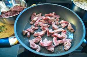 Portionen im heißen Butterschmalz ca. 3 Minuten braten und dabei darauf achten, dass das Fleisch noch medium ist. Das Fleisch in einer Schüssel warm halten, bis alles fertig gebraten ist.