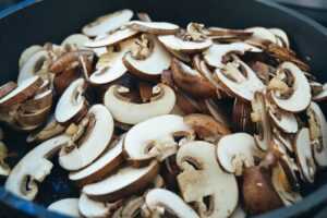 Die Pilze säubern und etwas vom Stiel abschneiden, dann die Pilze in Scheiben schneiden