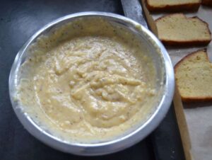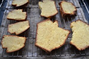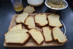 Das 2 Tage alte Brioche in dickere Scheiben schneiden diese am besten auf ein Kuchengitter legen und
