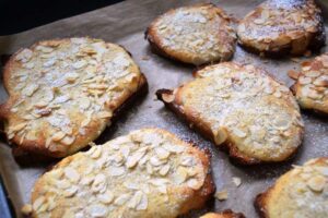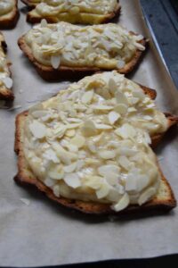 einige gehobelte Mandelblätter über die Mandelcreme streuen . Die Scheiben auf ein mit Backpapier ausgelegtes Backblech legen