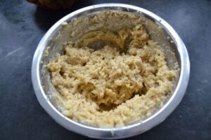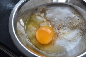 Die gemahlenen Mandeln mit dem Zucker und dem Ei gut verrühren
