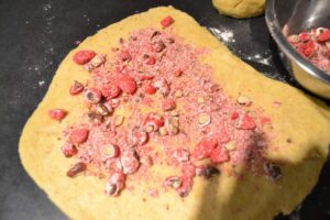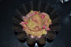 in der Zwischenzeit die rosa Mandeln grob hacken. Ich fülle sie in einen Beutel und zerschlage sie etwas, mit einem Hammer oder schwerem Topf.