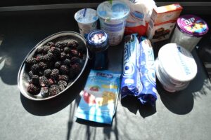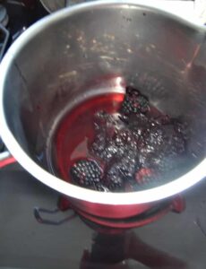 Die Brombeermarmelade mit dem Cassis und 100 Gramm Brombeeren erhitzen. Dann alles im Mixer pürieren und die ausgedrückte Gelatine in der warmen Flüssigkeit gut verrühren, dass sie sich komplett auflöst. In einer Extra-Schüssel den Frischkäse mit dem Joghurt und dem Puderzucker und dem Vanillezucker glatt rühren