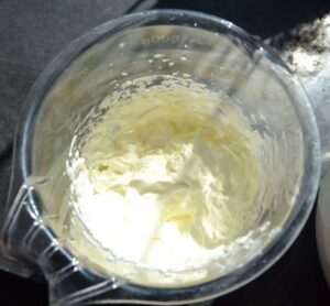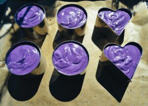 Die Creme etwas gelieren lassen und wenn sie dickflüssig ist, die Creme in die Förmchen füllen Ich habe bei 35 Grad die Törtchen zubereitet, die Creme habe ich wegen der Hitze 5 Minuten in den Kühlschrank gestellt.