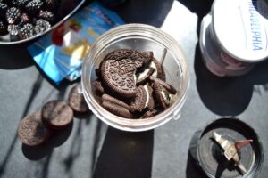 Die Oreo Kekse etwas klein brechen und die Butter kurz erwärmen z.b. in der Mikrowelle