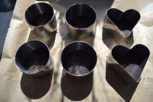 Auf ein Backblech oder eine Platte Backpapier legen und die Förmchen nun mit etwas Keksmasse befüllen. Den Keksboden etwas andrücken. Man kann statt der Förmchen auch eine Springform oder ähnliches nehmen.